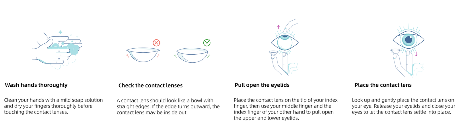 - Move the contact lens steadily toward your eye. When putting in the lens, look up, then slowly release your eyelids and close your eyes for a moment to let the lens settle. Repeat the above steps for the other eye.