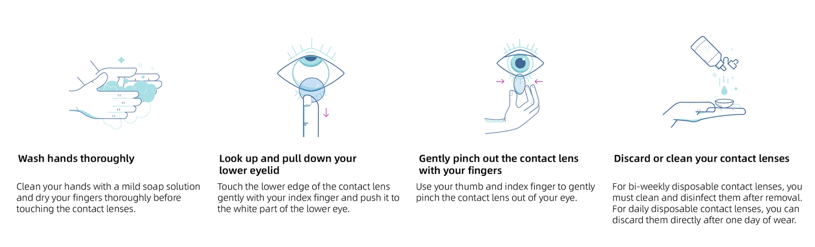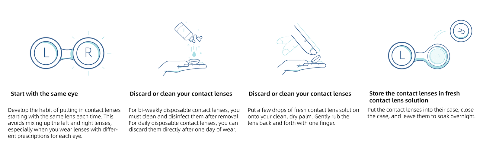 - Discard daily disposable contact lenses. For bi-weekly, monthly, and annual disposable contact lenses, make sure to clean and disinfect them.