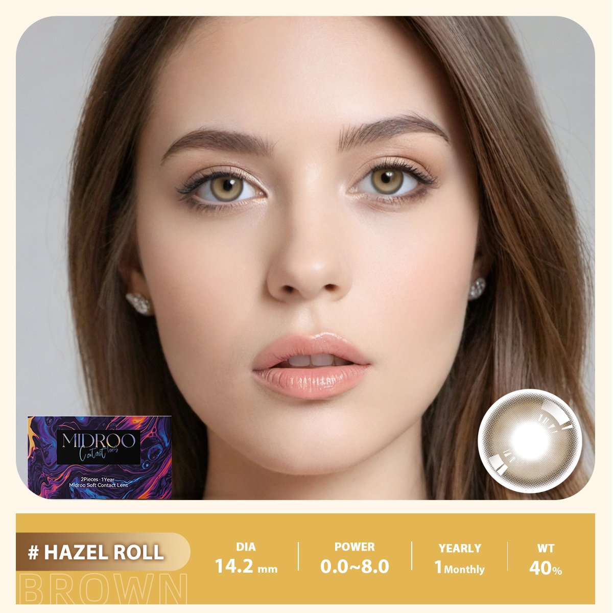 Hazel Roll Brown 14.2mm TGA Approved Colored LensThe Midroo Hazel Roll Brown 14.2mm lens is expertly designed to provide the most beautiful Natural Brown Contacts look. The “Hazel Roll” design features a soft, rolling pattern that blends seamlessly with your natural iris, resulting in a gentle, warm brown tone. This lens provides perfect 14.2mm Subtle Enlargement, enhancing your eyes without looking artificial. Furthermore, this lens is TGA Daily Comfort tested and approved. Choose Hazel Roll Brown 14.2mm for certified safety, an effortless natural style, and the ultimate Natural Brown Contacts experience.
